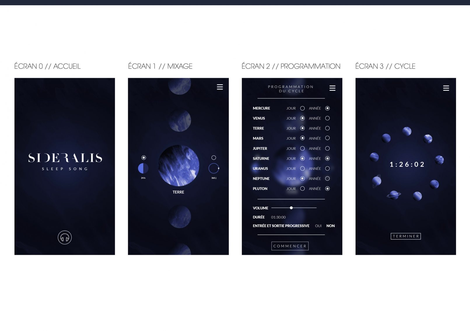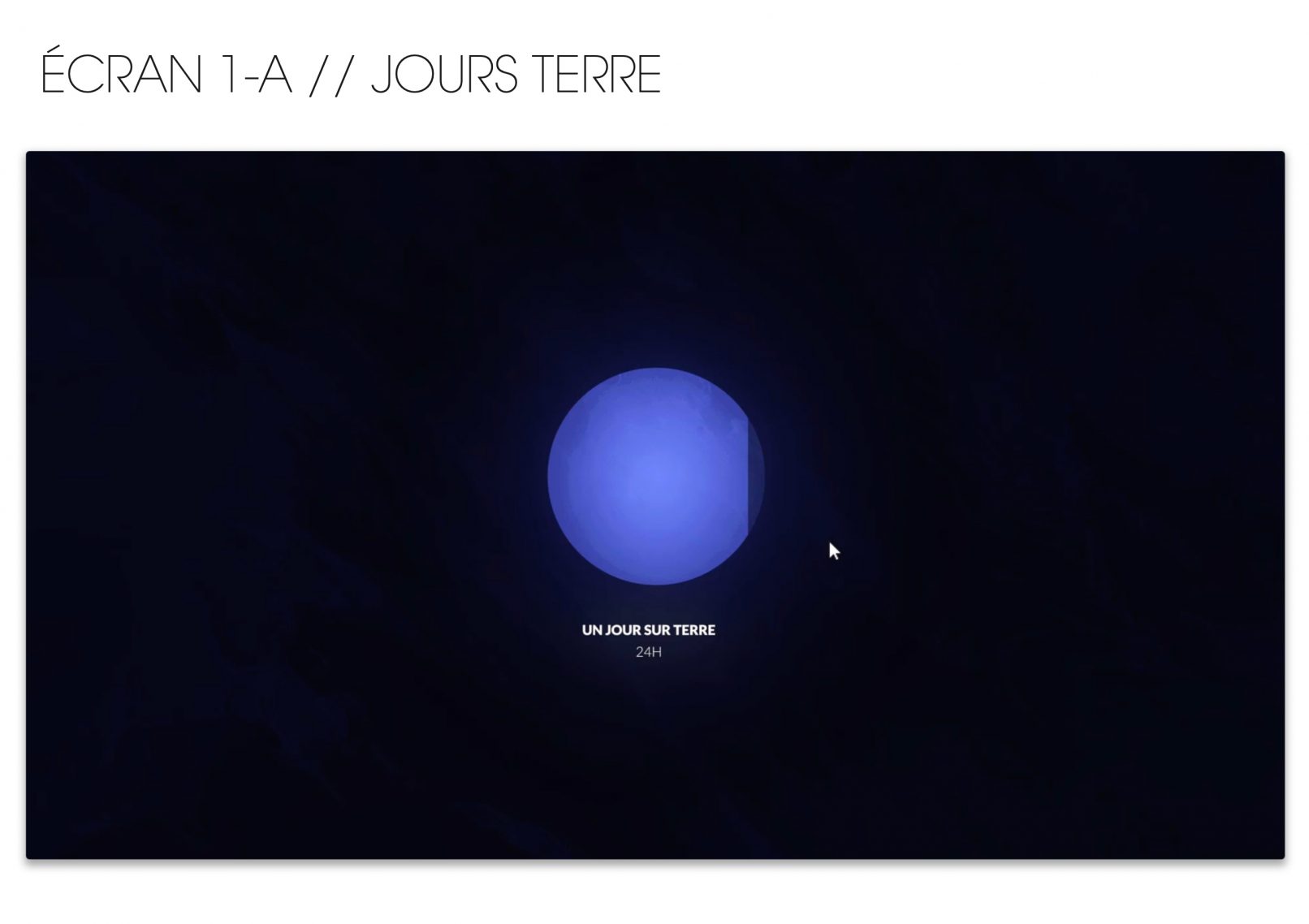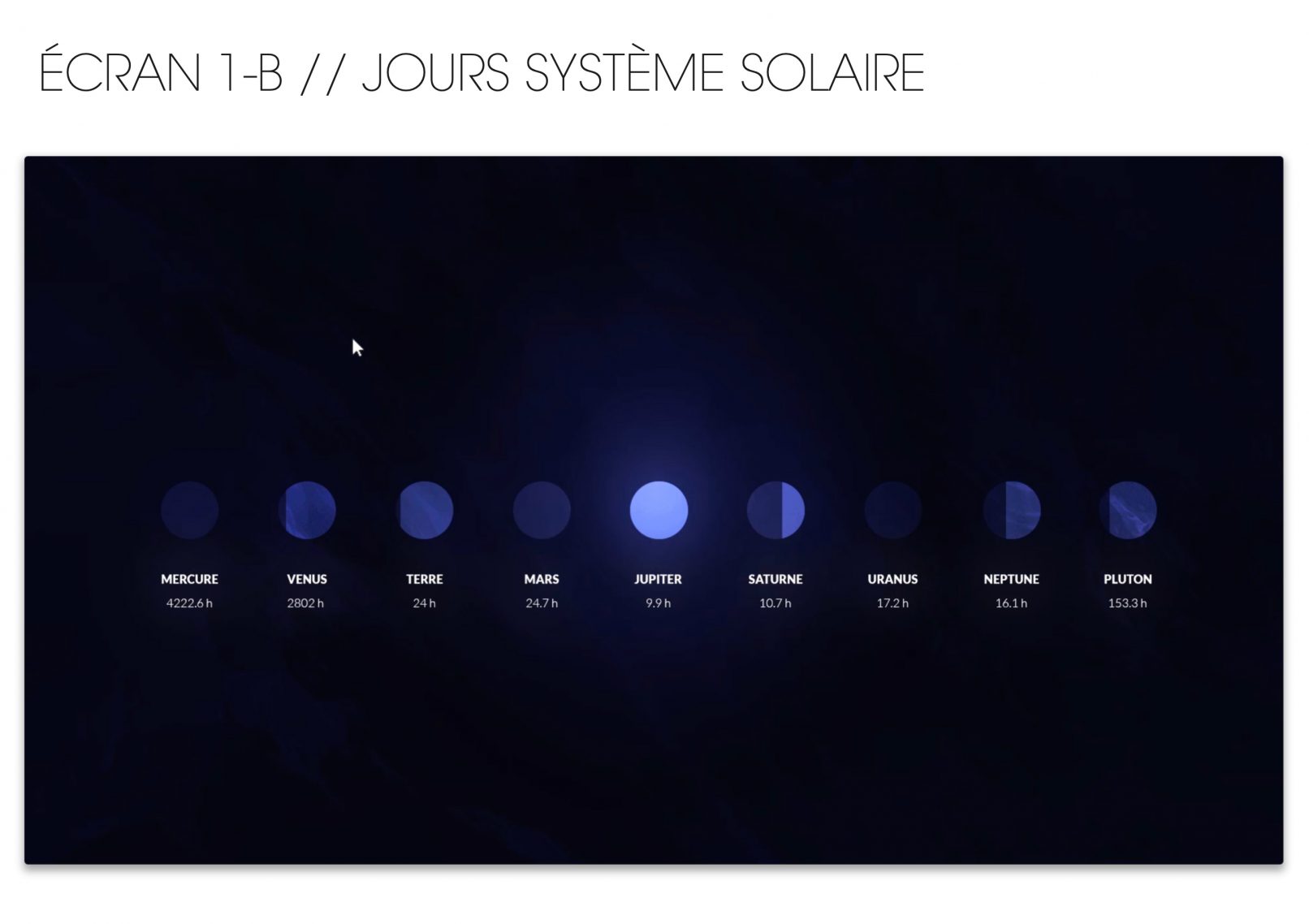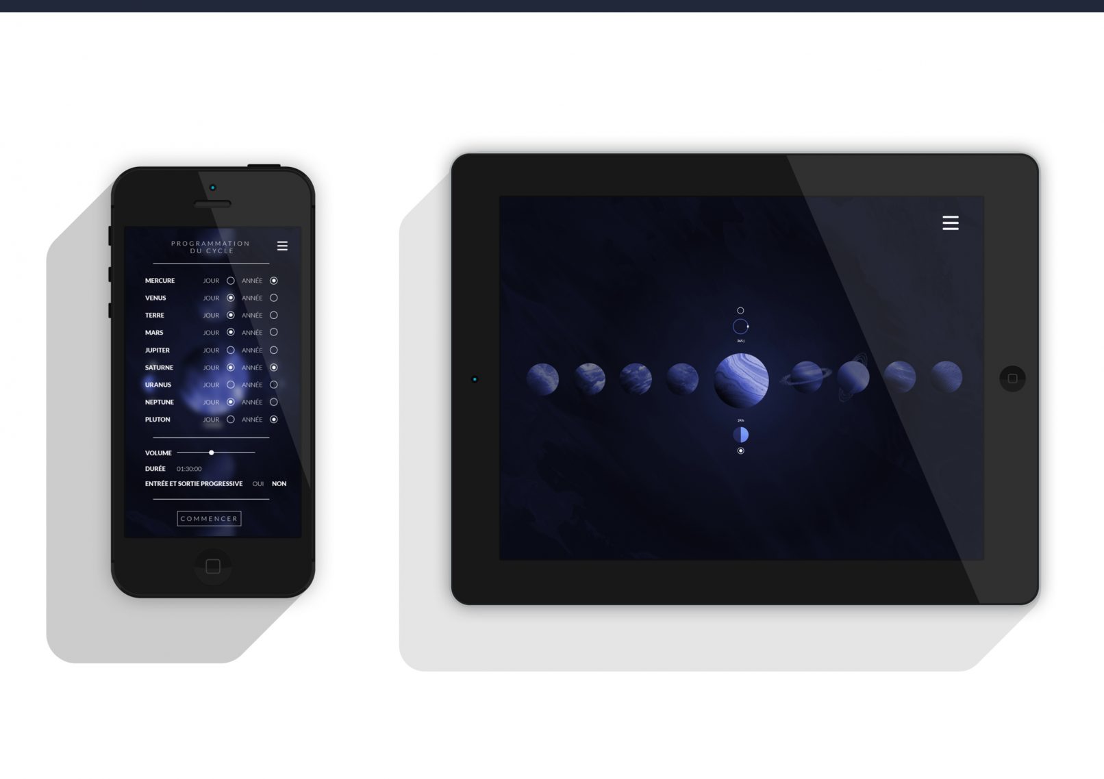 Au départ de ce projet, je souhaitais mieux comprendre notre définition du temps, et plus particulièrement la mesure de celui-ci. Le temps est avant tout une notion humaine, et sa mesure est basée sur l’observation de phénomènes périodiques observables dans l’environnement naturel. Historiquement, les premiers calendriers humains sont déjà basés sur l’observation de phénomènes astronomiques depuis la terre, comme le déplacement de la lune et du soleil dans le ciel. Ainsi, une journée correspond au temps séparant le lever et le coucher du soleil, et une année correspond au temps que met la terre à effectuer une révolution complète autour du soleil. Néanmoins, ces unités de mesure établies par l’homme sont définies par une observation faite depuis la planète Terre. Si on se place comme observateur sur une autre planète de notre système solaire, les unités de mesure du jour (période de rotation synodique) et de l’année (période de révolution sidérale) se déforment jusqu’à parfois perdre de leur sens acquis dans un contexte terrien. Ainsi, sur Mercure une journée dure par exemple 176 jours terriens et une année en compte seulement 88. Le projet Sidéralis explore comment rendre compte de la déformation de la rythmique du temps dans un contexte astronomique de façon visuelle, simultanée et interactive.